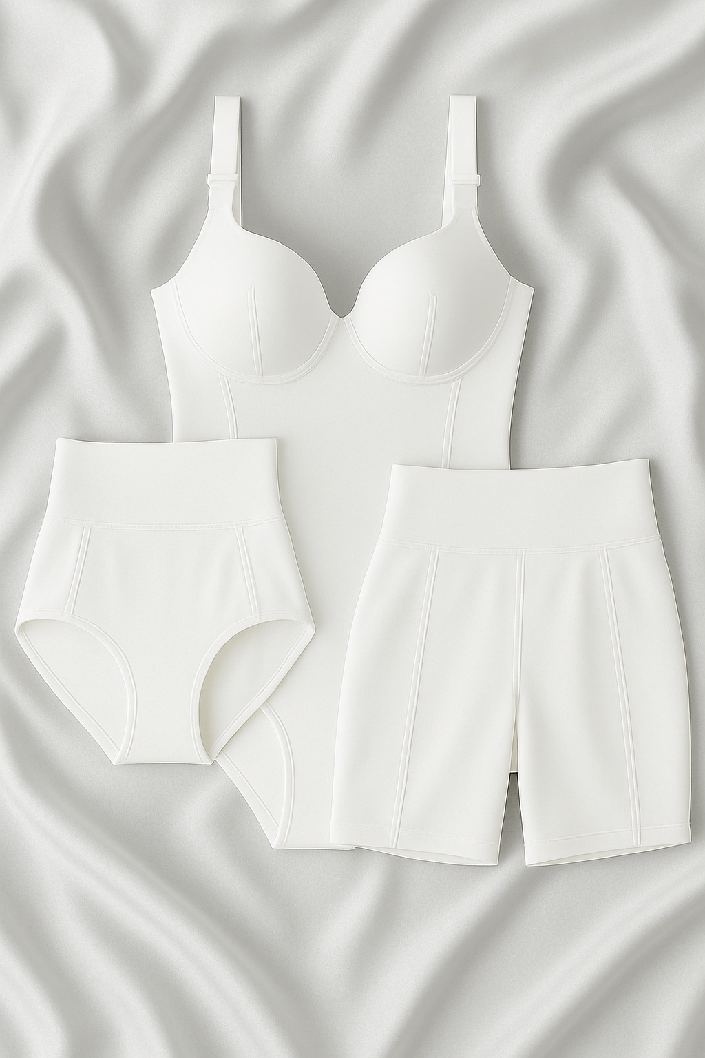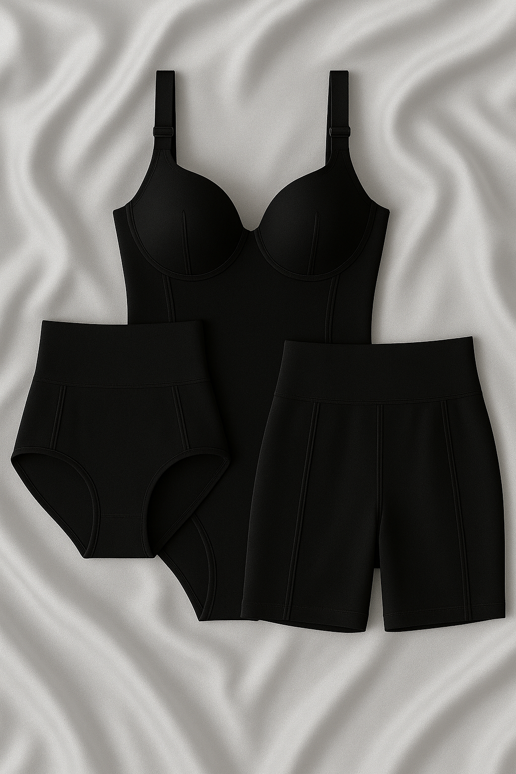 Transformation complète – La combinaison du body, du short et de la culotte affine la taille, sculpte le ventre et galbe les cuisses pour une silhouette redessinée.